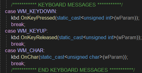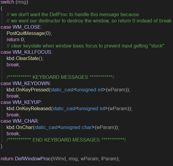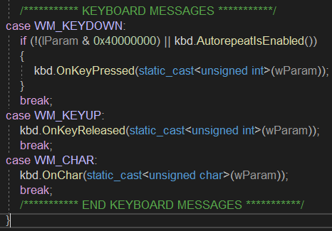 이제 이 Keyboard는 window의 Public으로 만들어 주면 됩니다. 그렇다면 이 Keyboard의 입력을 감지하는 부분을 어디에 끼워주면 좋을까요? HandleMsg함수에 끼워주면 좋겠습니다. 작은 실험까지 함께 진행해보도록 합니다.