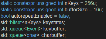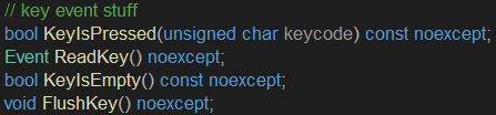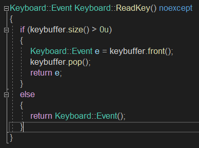 다시 ReadKey함수로 돌아가서, keybuffer에 어떤 event가 남아 있다면 그것을 추출하고 반환하지만 아무것도 없다면 Type::Invalid와 keycode = 0u로 설정된 Event 인스턴스가 반환될 것입니다. 그리고 c++17이상의 경우엔 std::optional을 사용할 수도 있습니다. 그렇게 되면 Default Constructor가 필요 없어질 테니까요.