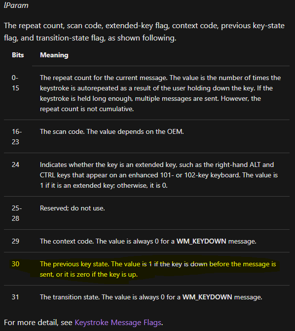 이렇게 각각 bit마다 뚜렷한 의미가 있고 Auto Repeat의 의미에 가장 부합하는 bit는 30입니다. 즉, bit 30의 정보를 체크하면 현재 누르고 있는 키가 이전에도 눌렸는지를 확인하는 것이 가능해질 것입니다. 당연한 말이지만, WM_CHAR에 대해 이 기능을 적용할 경우는 극히 드물 것입니다.