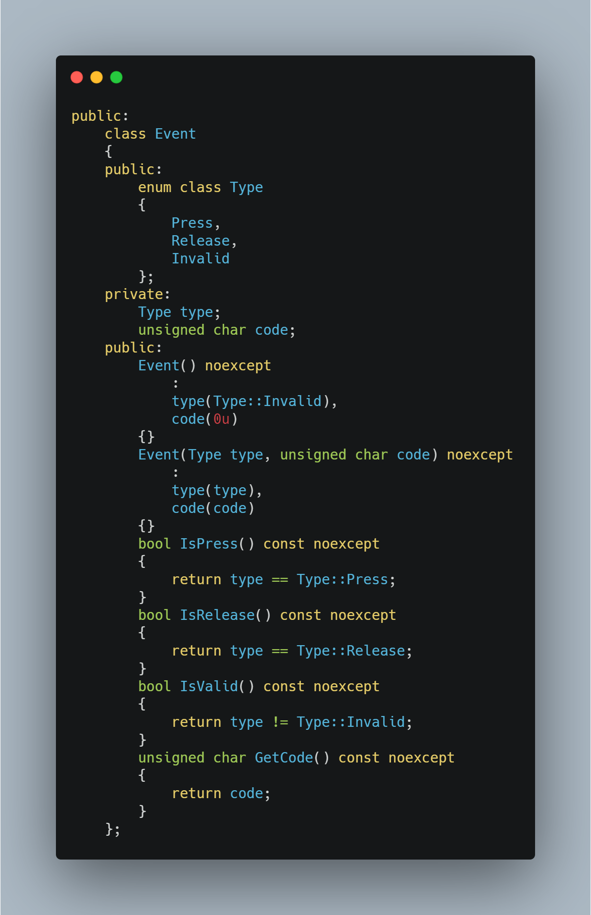 Event라는 inner class에는 Enumeration type으로 정의된 class가 하나 있습니다. Event의 instance는 default constructor가 호출될 시에 Type::Invalid로 설정되어 있다는 점이 눈에 보입니다.
