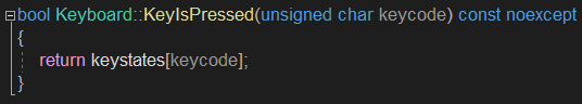 Key code라는 개념이 계속 등장합니다. " Key code MSDN "을 검색하면 Virtual-Key Codes (Winuser.h) - Win32 apps | Microsoft Docs여기로 연결이 됩니다. 모든 Key 값은 Hexadecimal notation으로 Mapping이 되어 있으며 가장 큰 값이 0xFE(VK_OEM_CLEAR)으로 10진수 254에 해당합니다. 위의 사진을 보시면 static constexpr unsigned int nKeys의 값을 256u으로 설정한 것을 확인할 수 있는데, 바로 이 이유 때문입니다. Key code가 아무리 커도 256bits, 1byte를 넘어가지 않기 때문입니다. 그리고 Bitset은 C++ bitset and its application - GeeksforGeeks여기에 설명이 잘 나와 있었습니다. 256개의 boolean을 하나의 Byte로 묶어서 보관하고 Index를 통해 접근하겠다는 강력한 의지가 느껴집니다.