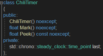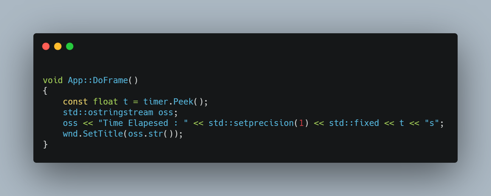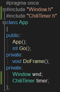 mark함수를 호출하면 마지막으로 이 함수를 호출했던 시점부터 지금까지의 경과된 시간을 반환합니다. Peek함수는 똑같이 mark함수를 마지막으로 호출한 시점부터 Peek를 호출하기까지 경과된 시간을 반환하지만 Mark가 시간을 초기화하는 것과는 다르게 Peek는 초기화 하지 않습니다. 이제 이 Timer Object를 App Class에 추가해줍니다.
