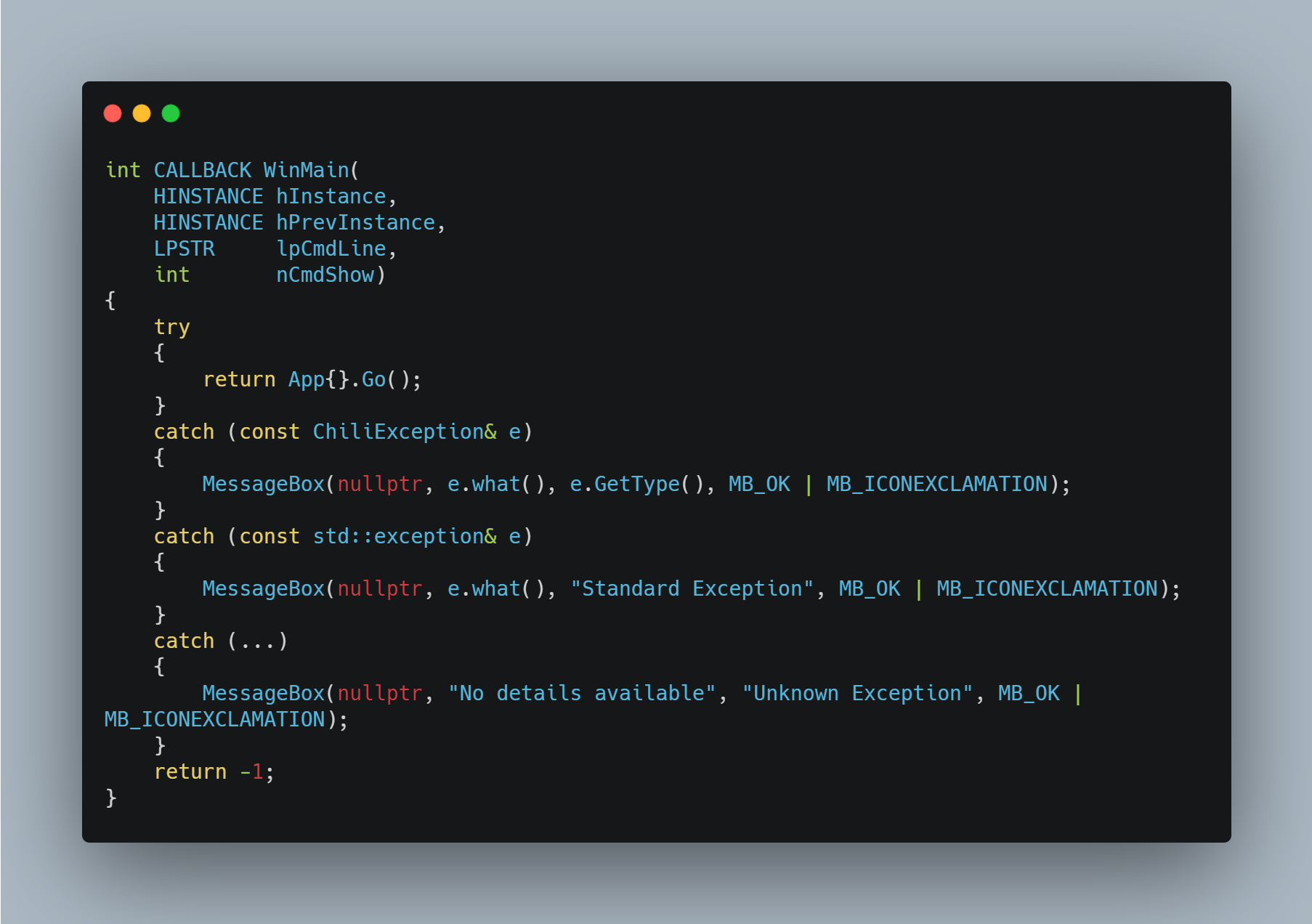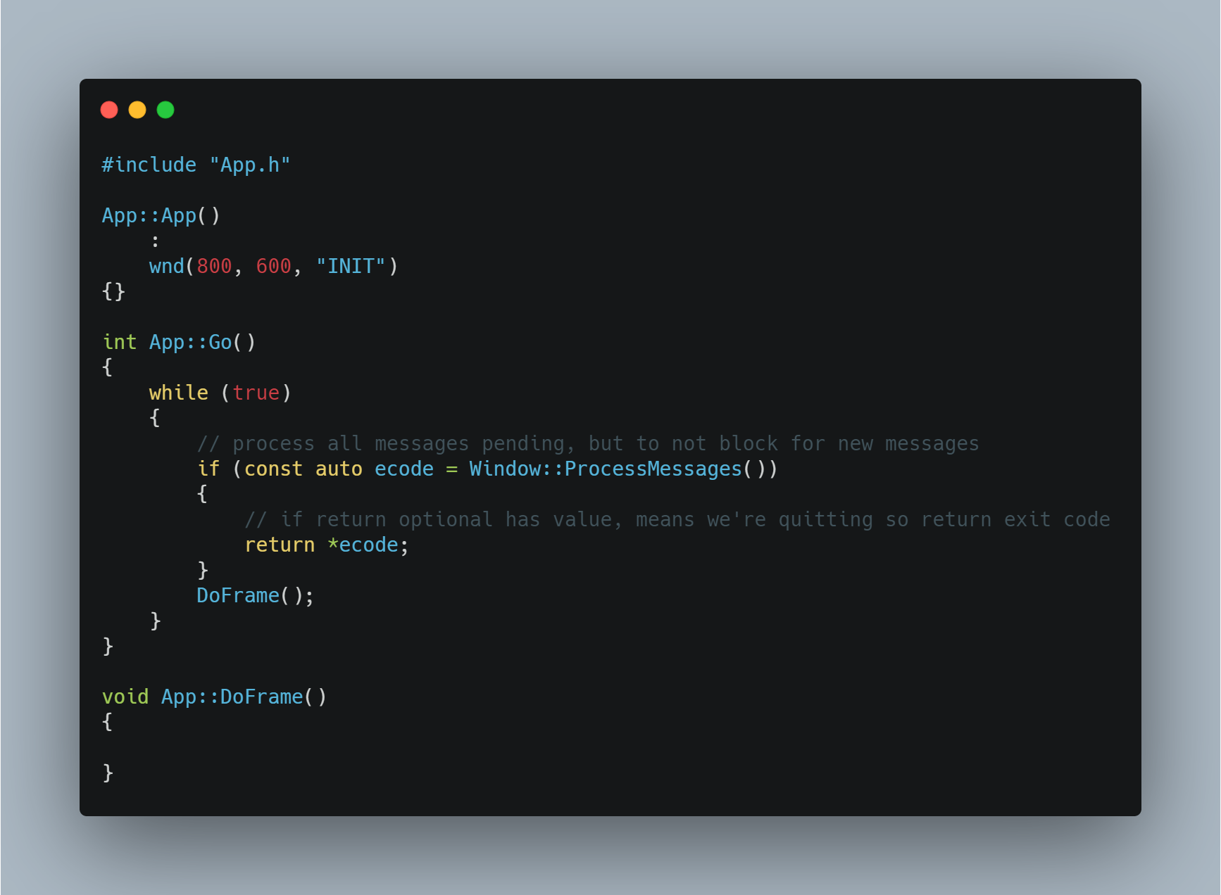 Constructor와 Go, DoFrame으로만 구성된 간단한 Class입니다. 이렇게 되면 모든 Logic은 DoFrame 안에서 해결이 될 것입니다. Go는 Application이 시작되면 호출이 될 것이고 이 함수가 Game이나 다른 무언가의 기본적인 Loop를 시작합니다. 또한 당연히 이 App이 Window를 갖고 있어야 합니다.