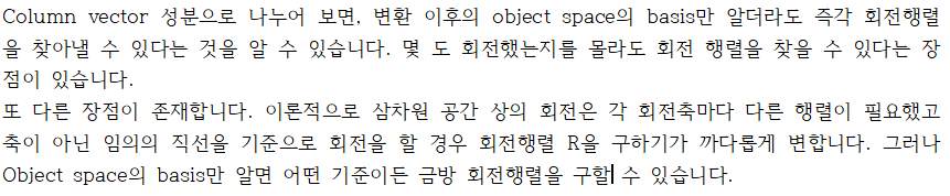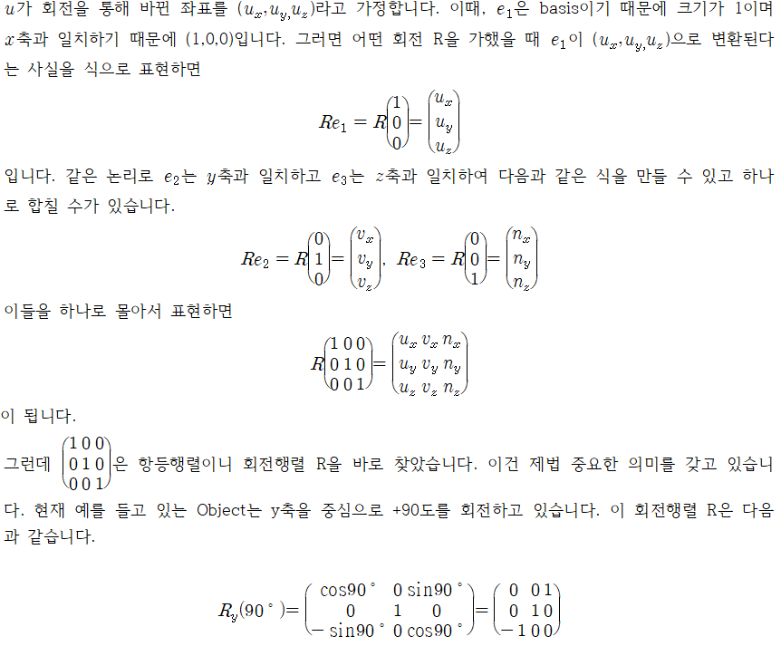 Object space 상의 어떤 물체를 회전한다는 것은 단순히 vertex를 이동하는 것에서 그치는 것이 아닙니다. World space로 개념이 확장되면서 object가 중심으로 삼는 각 축이 함께 회전했다고 보는 편이 타당합니다. 즉, world space의 축은 돌지 않았지만 object space의 축은 돌아갔다고 보는 겁니다.