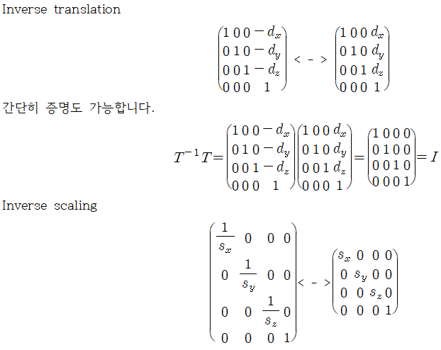 회전, 확대, 이동을 했다면 다시 반대로 가는 작업도 존재할 수 있습니다. 조립은 해체의 역순입니다. 이들은 약간 다릅니다. Inverse translation은 어렵지 않습니다. 이동한 만큼 되돌아오면 그만입니다. Scaling역시 배수 만큼 역수를 취하면 그만입니다.