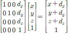 translation은 벡터의 합의 형태지만 곱의 형태로 만들 수 있었습니다. 삼차원 공간에서도 똑같은 일을 합니다. 3x3 행렬을 4x4로 만들어 진행합니다. 이차원 공간 상에서 Cartesian coordinates를 Homogeneouse coordinates로 바꾸어 사용했던 방법이 삼차원 공간 상에서도 똑같이 적용됩니다.
