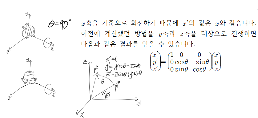 이차원 공간에서 회전을 하기 위해서는 점을 기준으로 회전했습니다. 하지만 삼차원 공간에서는 점이 아니라 축을 두고 회전을 합니다. 따라서, 삼차원 공간 상의 회전은 회전하는 축을 기준으로 각기 다른 회전의 양상을 보입니다.