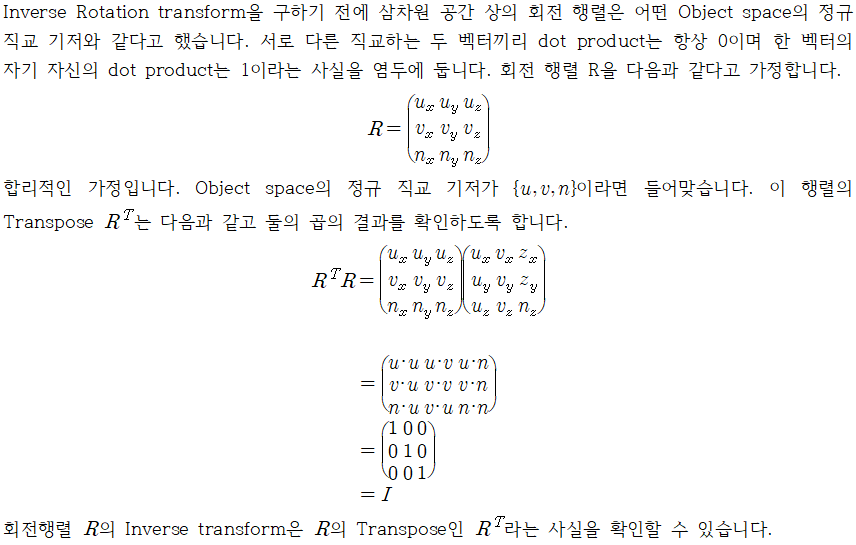 inverse translation, inverse scaling은 각각 traslation transform과 scaling transform과 곱하면 identity matrix를 얻었습니다. Rotation도 크게 다르지 않을 것이라고 예상할 수 있을 것 같습니다. 왜냐하면, Identity matrix가 나왔다는 것은 한 행렬이 다른 행렬의 역행렬이며 현재 공간 상에서 정반대의 행동을 암시하기 때문입니다.