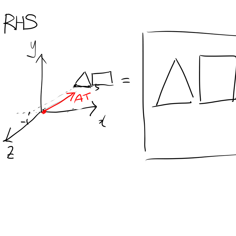 차라리 RHS를 왼손의 엄지, 검지, 중지를 서로 직각을 이루도록 펼치고 중지-x, 검지-y, 엄지-z라고 두는 편이 직관적이고 좋았습니다. LHS는 이 반대니까 또 그림을 그릴 필요는 없습니다.