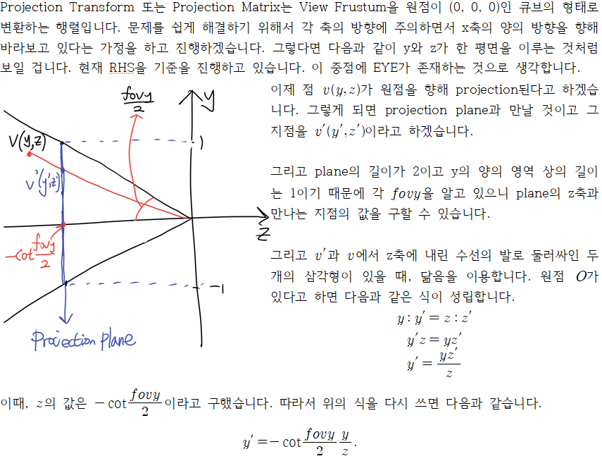 또, View Frustum 상의 물체들의 각 Vertex에서 EYE를 향해 빛을 쏜다면 반드시 그 빛은 Projection Plane이라고 적힌 평면에 부딪히고 상이 맺히게 됩니다.