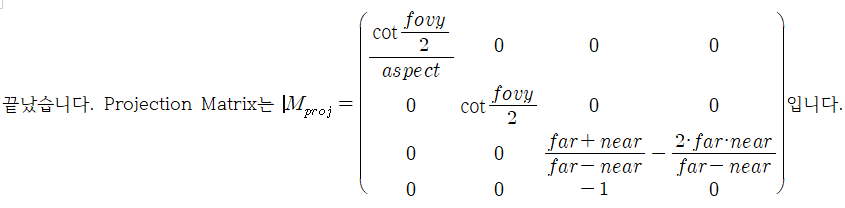 개인적으로 그래픽 이론 수업에서 꽃이라고 여겼습니다. EYE, AT, UP등의 요소들은 Camera의 External Parameters라고 합니다. 그럼 Internal Parameters도 존재할 겁니다. 카메라 렌즈, 줌의 정도, 굴절 등등이 Internal Parameters입니다. 이 Projection Transform은 Internal parameters에 의해 결정이 됩니다.