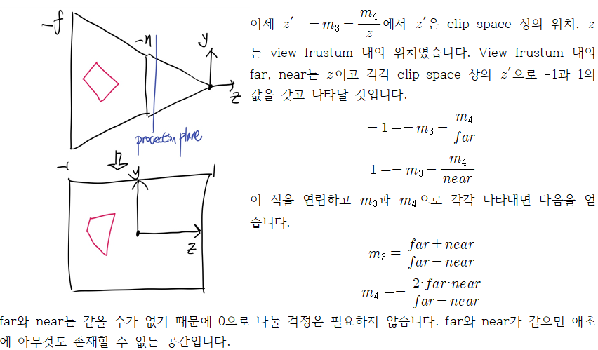 상이 맺히기 시작하는 공간에서 카메라까지 가장 가까운 지점을 n[near]이라고 합니다. 또 멀리 떨어진 지점을 f[Far]이라고 합니다. 아래의 그림에서 -f와 -n이로 표현된 지점이 각각 far와 near입니다. far는 게임의 경우 얼마나 멀리 렌더링 할 것인지 결정하는 요소가 됩니다. f의 값에 따라 100m까지 또는 1000m까지 보일 수 있게 됩니다. 아마, 옵션에서 Far라는 옵션이 있는 게임이 있을 수도 있습니다.