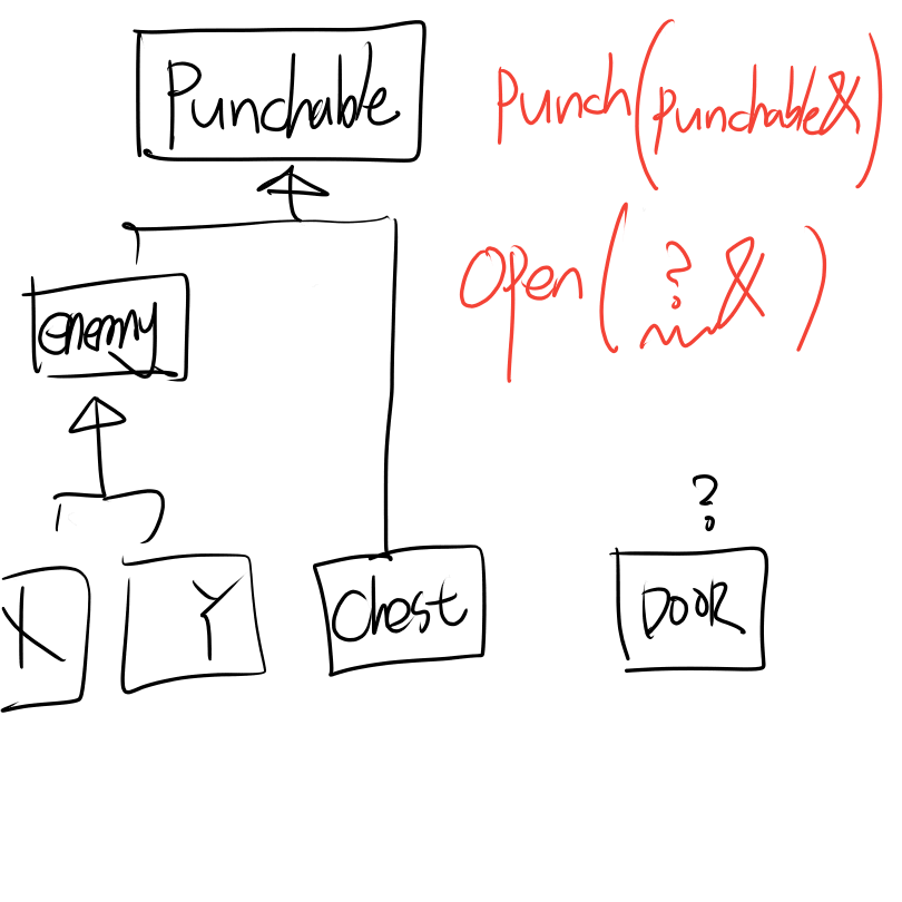Interface는 일반적인 inheritance와 차이가 있습니다. 가령, 어떤 게임 상에 존재하는 상자와 문, 몬스터들은 모두 Punch가 가능합니다. 따라서 디자인을 다음과 같이 하면 문제가 발생합니다.