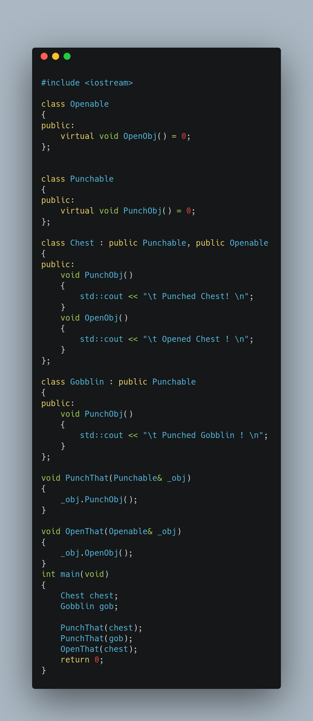 이렇게 만들면 곤란할 일이 적어집니다. OpenThat함수는 Openable의 interface를 받은 모든 오브젝트를 열 수 있습니다. 마침 C++는 여러 개의 상속을 받을 수 있기 때문에 이러한 성질을 이용하여 Chest class가 open과 punch 모두 가능한 오브젝트가 되었습니다. 아주 재밌습니다. C#과는 다소 차이가 있습니다. 애초에 C#에는 Interface가 존재하는 모양입니다.