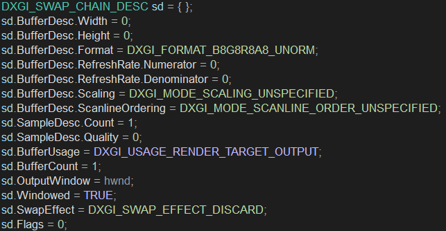 이제 SwapEffect라는 요소가 등장하는데 화면에 뭔가를 출력하고 이 픽셀들을 어떻게 처리할지 결정하는 겁니다. 대부분의 상황에서 이 DXGI_SWAP_EFFECT_DISCARD가 준수한 성능을 내기 때문에 이것을 채택하도록 합니다. 마지막의 Flags는 추가적인 옵션인데 MSDN 문서를 참고 하는 편이 수월합니다.