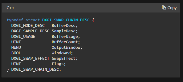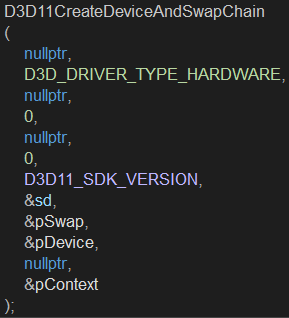 8. *pSwapChainDesc : SwapChain의 Description의 구조체에 대한 포인터를 요구합니다. 이 Description이라는 개념은 앞으로 계속 나올 것이며 D3D에서 무언가를 Setup하는데 자주 사용되는 방법입니다. 특히, HWND의 정보도 여기에 함께 묶여 보내질 것입니다.