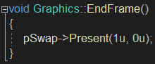 끝난 것이 아닙니다. 이걸 Build하고 실행하면 기존과 달라진 것이 아무것도 없습니다. Back Buffer를 Front Buffer에 Present하는 일을 해야 합니다. Flipping이라고도 합니다. 그걸 EndFrame이라는 함수에 작성하기로 합니다. 이 함수가 모든 것들의 전제[Prerequisite]입니다. 왜냐하면 어떤 픽셀이든 출력을 안 하면 없는 것과 마찬가지이기 때문입니다.