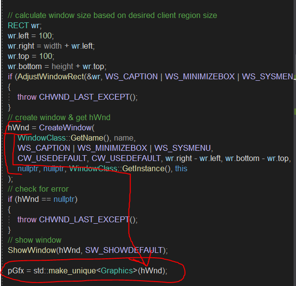 Graphics는 Parameter로 반드시 HWND를 요구합니다. HWND는 어디서 Initialise되는가 하면 다음 부분입니다.