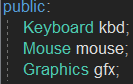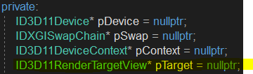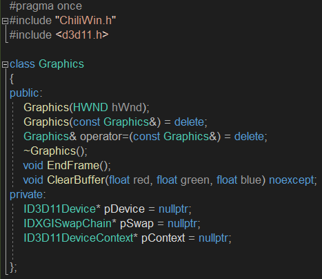 보면 이 함수의 Parameter가 쭉 나옵니다. 필요한 오브젝트들을 확인할 수 있고 만들어 줄 필요가 있습니다. ID3D11Device, IDXGISwapChain ID3D11DeviceContext이 세 가지는 Graphics라는 Class를 만들어서 Member로 갖도록 구현합니다. 나머지 포인터들은 어쩌면 좋을까요.