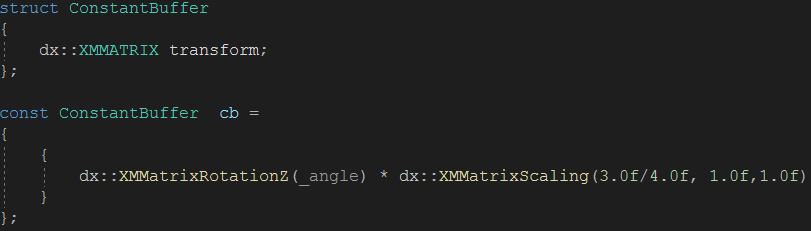 별 것 아니지만 생산성이 향상됩니다 가장 먼저 대체할 수 있는 것은 당연히 행렬입니다. 육각형을 회전 시키기 위해서 선언했던 행렬을 dx로 대체합니다. 기본적으로 XMMATRIX는 floating point의 4x4 행렬입니다. 주의할 점이 있습니다. 이렇게 선언된 XMMATRIX라든가 DirectXMath의 각종 인스턴스는 직접 접근하지 말고 Interface를 통해서 접근하는 편이 좋습니다. 일종의 Black Box인데 나름의 방식으로 SIMD 최적화를 시키기 위해 데이터들을 Load했기 때문입니다.