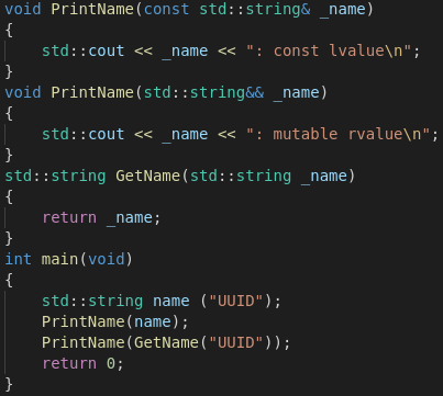PrintName이라는 함수는 첫 번째에 const lvalue를 받는 함수가 있고 두 번째에 해당 함수를 overload해서 mutable rvalue reference를 받도록 했습니다. GetName함수의 반환은 rvalue입니다. 만약 overload한 printName함수가 없었다면 const lvalue가 모든 값을 받아서 처리했을 것입니다. 그래서 이런 내용이 생성자, Class와 어떤 연관이 있다는 것일까요?