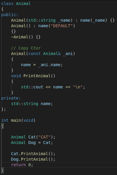 이 코드를 실행시켜보면 개나 고양이나 고양이라고 나옵니다. Dog Instance를 Cat instance를 통해 initialise했습니다. 따라서 정의에 의하면 같은 Class의 object(Cat)로 다른 object(Dog)를 initialise했기 때문에 Copy Ctor가 호출되었고 해당 member function의 정의대로 Dog의 Name이 Cat이 되었습니다. 이게 중요한 것이 아니고 다음과 같은 사실들이 정말 중요합니다. 대체 어떤 경우에 Copy Constructor가 호출이 되는 것인가?