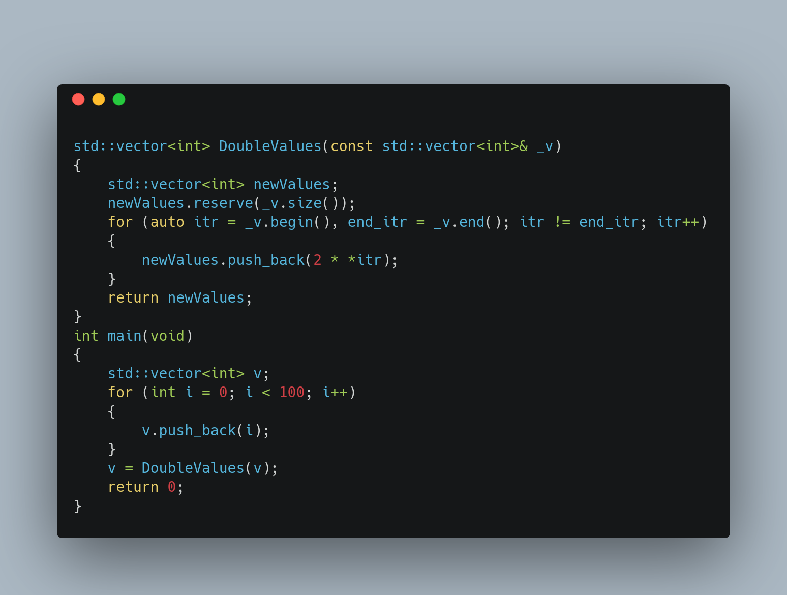 언뜻 문제가 없는 코드 같습니다. 실행도 되긴 합니다. 하지만 공간의 효율의 관점에서 보면 문제가 있습니다. v = DoubleValues(v);를 실행하는 순간에 우리는 이론적으로 v에 대한 두 개의 복사본을 갖고 있습니다. 하나는 함수를 호출하며 들어가서 만든 새로운 newValues, 그리고 parameter로 전달해준 v의 복사본입니다. 그런데 여기서 return을 해버리면 newValues의 복사본이 또 생겨버립니다. 처음 만든 lvalue인 newValues vector는 scope를 빠져나가며 사라지되 반환형인 rvalue가 만들어지는 겁니다. Vector의 사이즈가 100이 아니라 압도적으로 거대했다면 성능에 엄청난 지장을 주었을 것입니다.