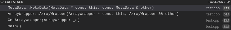 Callstack을 보면 이제 GetArrayWrapper의 return을 위해서 ArrayWrapper의 rvalue constructor가 호출되었음을 눈으로 확인할 수 있습니다.