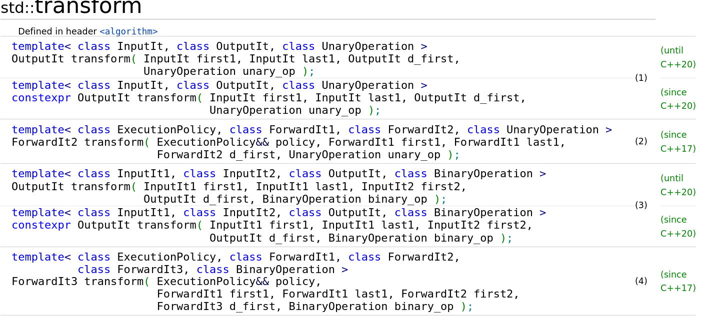(1)번의 정의를 보면 느낌이 옵니다. 어떤 Container의 범위에 대해서 Unary Operation을 수행하고 그 결과값을 다른 공간에 저장하는 역할을 수행합니다. 참고로 unary operation이란 operand(예를 들어서 +,-,%,/ 등등)가 하나만 있는 수식을 의미합니다. Unary operation -> (https://www.geeksforgeeks.org/unary-operators-cc/) 역시 직접 쳐보면서 이해하는 편이 빠릅니다.