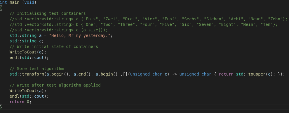 이러면 모든 std::string a의 문자가 uppercase가 되어서 c에 저장, 출력이 될 것입니다. 이 함수의 좋은 점은 Input Conatainer와 output container가 완전히 같아도 된다는 점입니다. container a의 첫 번째 문자를 대체하고 다음 문자를 검증하기 때문입니다. 즉, 위의 코드의 예제에서 다음과 같이 해도 결과는 같습니다.