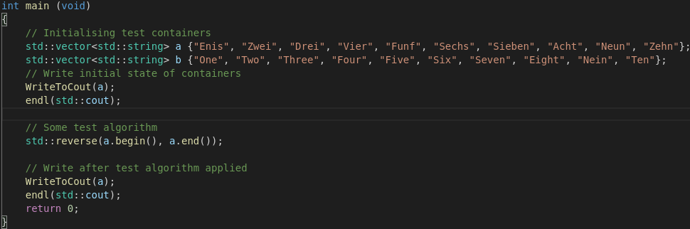 std::rotate, std::shuffle, std::reverse 등등은 여태 공부한 함수와는 다르게 어떤 값을 변화시키지는 않습니다. 임의의 컨테이너[Container] 내의 원소들의 위치를 바꿀 뿐입니다. std::reverse는 말 그대로 컨테이너 내의 원소들의 순서를 반전합니다.