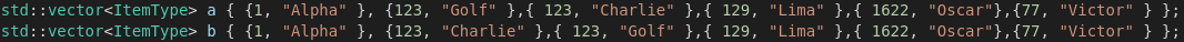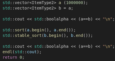조금 더 실험을 해보겠습니다. 정말로 이 요소간의 상대적인 대소를 유지시켜주는지 알아봅니다. 아이디어는 이렇습니다. 두 개의 대소가 비교 가능한 요소를 안고 있는 구조체를 만듭니다. 두 개의 서로 다른 벡터에 같은 구조체들의 인스턴스들을 집어 넣고 stable_sort와 sort를 각각 진행하여 같은지 다른지를 보면 됩니다. 대신에 완전히 같은지 아닌지 비교를 진행할 때는 구조체의 두 개의 요소가 모두 같아야 합니다.