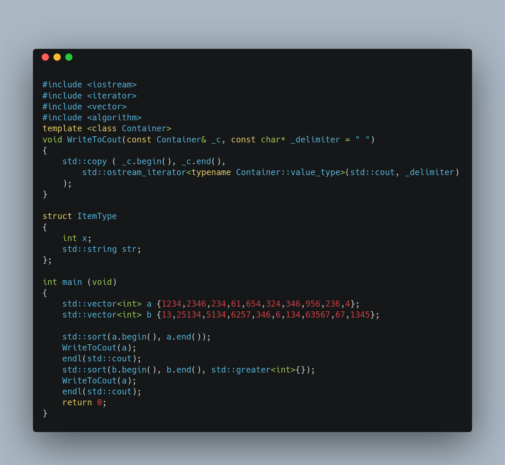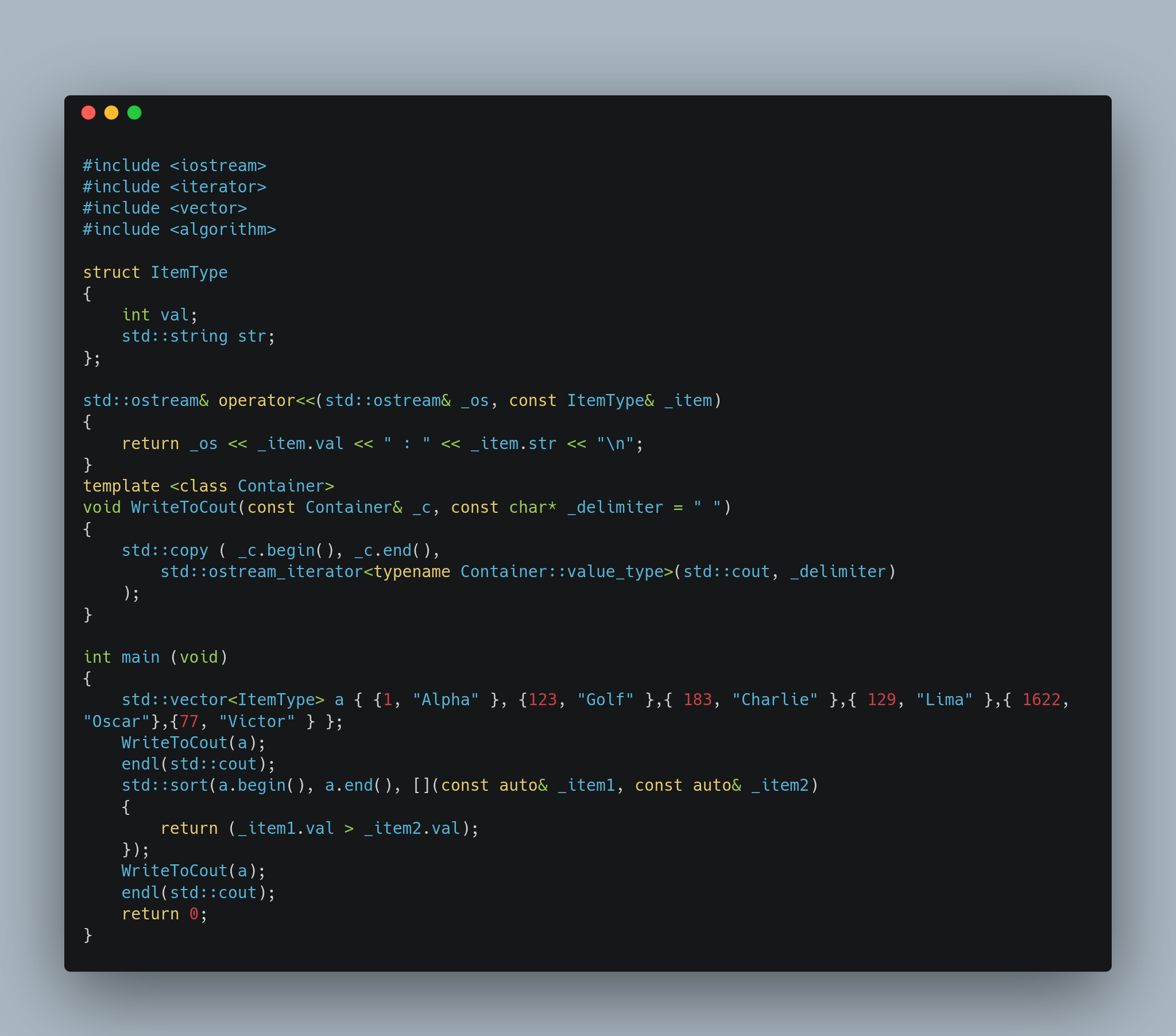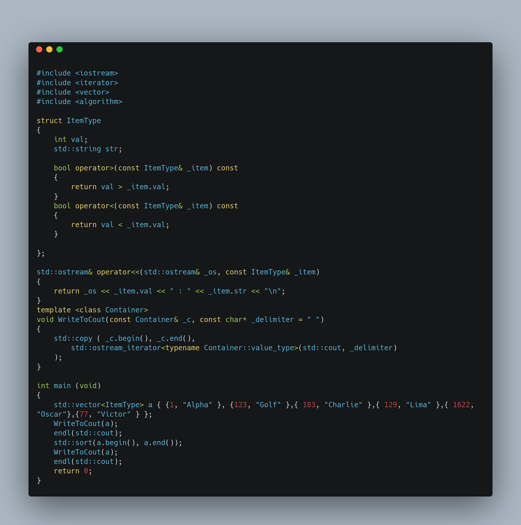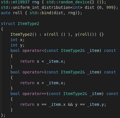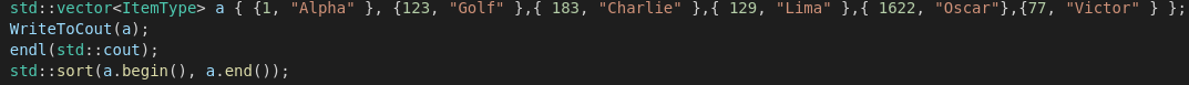편리한 함수이기는 하지만 Custom Defined Data Type에 대해서는 비정상적으로 작동할 가능성이 높습니다. 예를 들어서 이전에 작성했던 구조체 ItemType은 less than과 같은 operand가 정의되어 있지 않기 때문에 컴파일 단계에서 오류가 날 것입니다. 이런 상황에서 선택할 수 있는 해결 방법은 크게 두 가지가 있는데 하나는 std::sort의 세 번째 parameter에 적당한 식을 주는 것이고 하나는 필요한 operator를 overload 하는 것입니다.