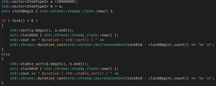 두 알고리즘의 차이는 Performace에 있습니다. 대체로 거의 모든 상황에서 Restriction이 적으면 적을 수록 알고리즘 자체에 부여되는 자유도가 높아지며 이에 비례하여 성능이 향상됩니다. 실제로 문서를 참조해보면 두 함수 모두 충분한 메모리 공간이 있다면 O(Nlog(N))의 time complexity를 갖지만 충분한 메모리 공간이 없을 경우엔 std::stable_sort는 O(Nlog^2(N))의 Time Complexity를 갖는다고 명시되어 있습니다. Process를 나눠서 실험해보면 무엇이 빨리 끝나는지 알 수 있을 것입니다. 시스템 프로그래밍 시간에 배웠던 지식이 빛을 보는 순간입니다.