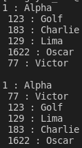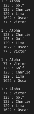 위와 같이 Golf와 Charlie는 123이라는 val을 갖고 있습니다. Sort를 진행하면 이 val을 기준으로 정렬을 할 것이고 이 값이 같으면 Golf, Charlie의 순서가 바뀌지 않을 것입니다. a와 b에 대해서 각각 진행하면 결과는 정말 그렇게 나옵니다.