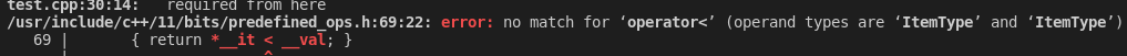 이러한 오류를 얻습니다. 잘 몰라도 operator<에 해당하는 ItemType과 ItemType간의 연산이 불가능하다는 사실 정도는 파악할 수 있습니다. 그래서 첫 번째 해결 방법으로 다음과 같이 작성할 수 있습니다. 오름차순/내림차순 원하는 기준에 따라 식을 달리하면 됩니다.
