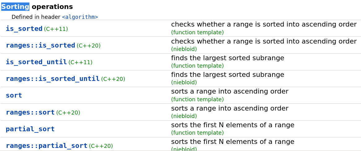 이 내용은 algorithm lectures 등지에 출현하는 내용이며 D3D의 기본과 관련성이 다소 떨어질 것 같습니다. 그럼에도 불구하고 Algorithm이기 때문에 <Algorithm> header에 있는 내용이기도 합니다. cppreference 홈페이지에 보면 이렇게 sorting을 위한 Section이 따로 있습니다.