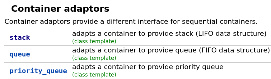 간결한 interface와 행여나 발생할 실수를 방지해 준다는 점에서 사용할 수 있지만 std::vector가 있음에도 불구하고 사용할 만큼 가치가 있는 것 같지는 않습니다. 그리고 std::stack은 template parameter로 자료형 T와 Container의 type을 받는데 Container의 type을 명시해주지 않으면 deque로 기본 생성됩니다. std::queue, std::priority_queue도 별로 볼 것은 없습니다. 이게 어떤 역할을, 어떤 기능, interface인가는 data structure가 더 적합한 분야일 것입니다.