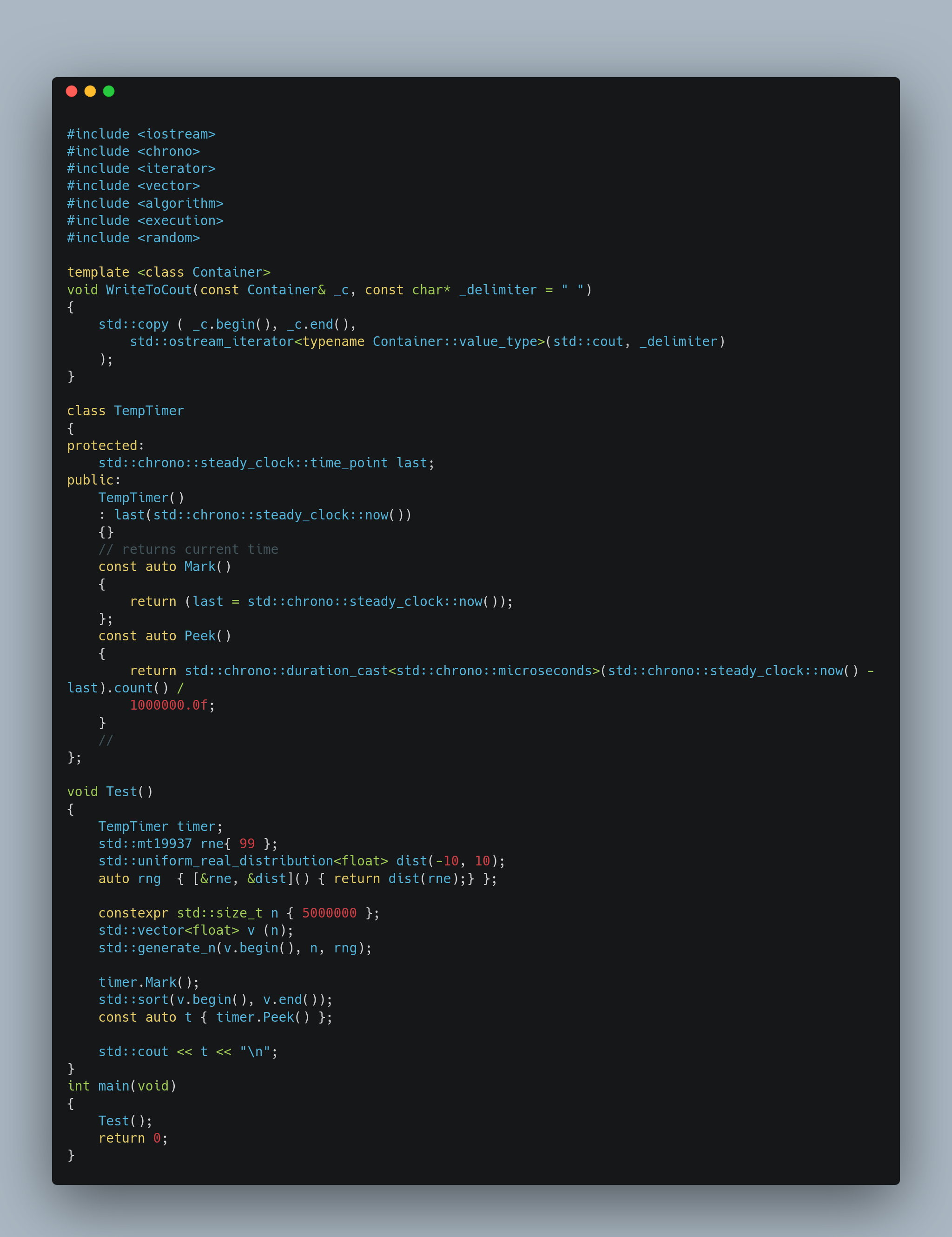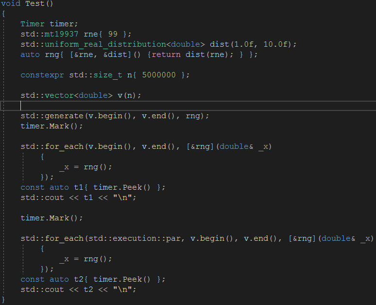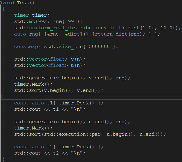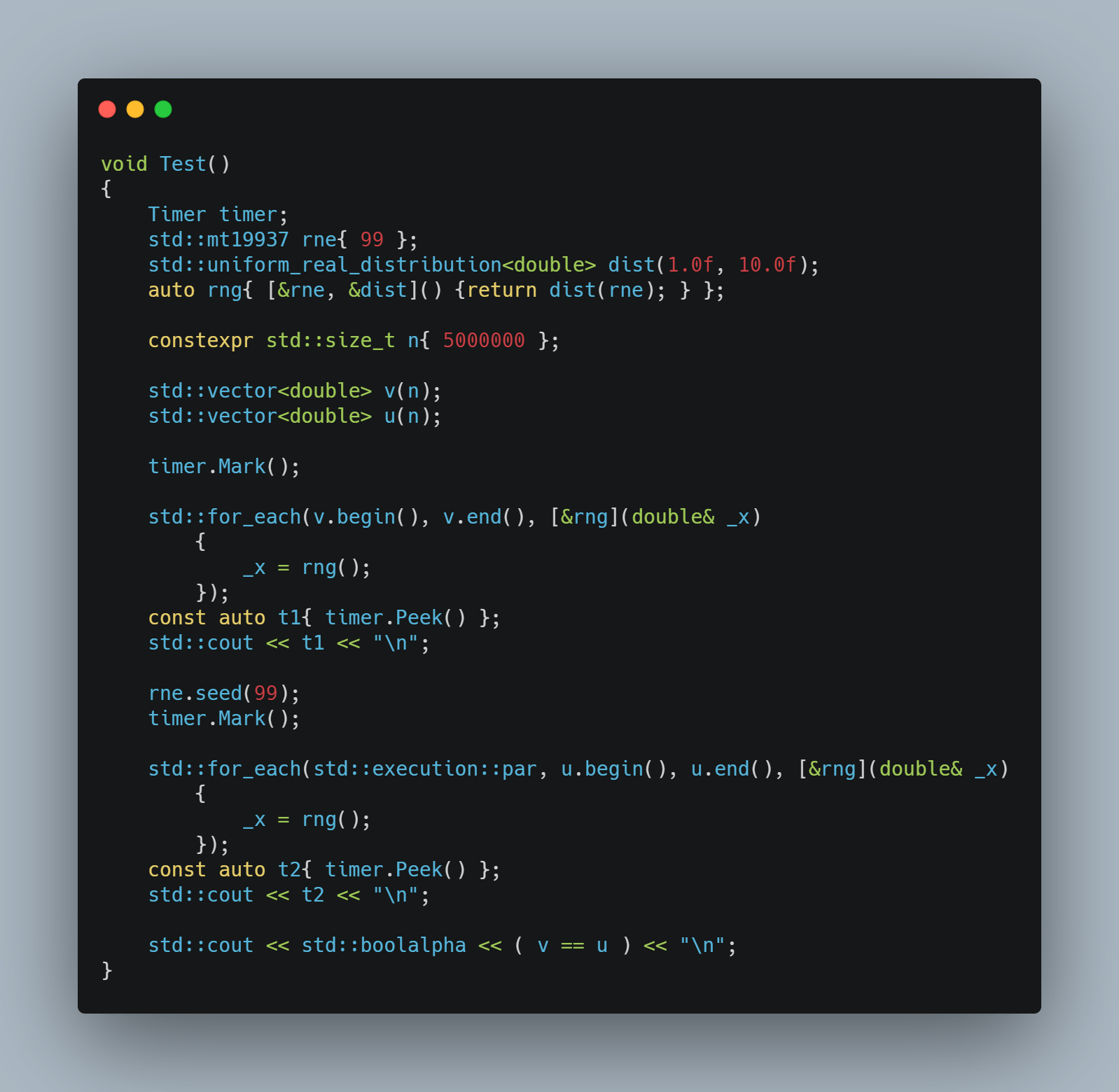 ? 더 느려진 것은 둘째치고 크게 차이가 나지 않습니다. C++17 표준부터 지원이 되는 execution이라는 글을 읽어서 compiler을 할 때 옵션에 -std=gnu++17을 줘도 결과는 같았습니다. 그런데 MSVC Compiler를 쓰면 정상적으로 정책을 사용했을 때 더 빠르게 계산이 됐습니다. 뭐가 문제인지 고민을 해봐야 할 것 같습니다. 아래는 MSVC Compiler를 사용한 코드와 결과입니다.