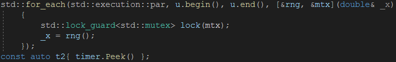 다음과 같이 std::mutex의 인스턴스 mtx를 선언하고 해당 scope에서 lock을 하도록 하면 다른 thread에서도 똑같은 시도를 하겠으나 먼저 lock을 건 thread가 RNE을 사용할 때까지 다른 thread는 lock도 못하고 접근도 못할 것입니다. 즉, 순차적으로 처리가 될 것이란 의미입니다. 그럼 성능 자체는 현저히 느려지겠으나 RNE이 엉망이 되지 않고 위의 코드대로 만들어 정렬하여 비교하면 True가 나올 것입니다.