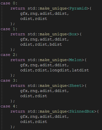 핵심은 unique pointer를 만드는 과정에 있습니다. Pyramid, Box, Melon 등등의 Drawable 객체들을 볼 수 있습니다. 이들의 내부를 살펴보면 다음과 같은 구성입니다.