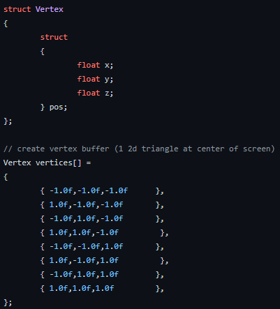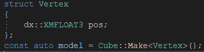 figure 1c Figure a의 첫 번째 Vertex Struct의 선언이 Box.cpp에 있습니다. Box의 인스턴스를 만들면( 여기서는 make_unique를 통해서 만들었으며 gfx를 비롯한 arguments들이 있습니다.) Box의 Vertex Buffer를 만들기 위한 준비에 착수합니다. 중요한 것은 Cube의 존재입니다.