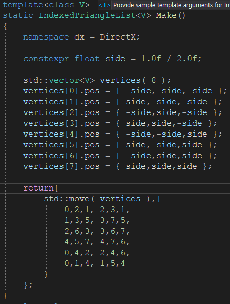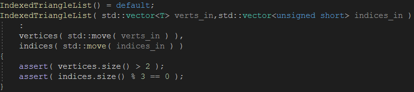 figure 1e Figure 1c를 참조하면 Template argument로 Vertex라는 구조체를 주었다는 사실을 알 수 있습니다. 이 함수는 단순히 벡터 두 개를 반환하는 것이 아니라 IndexedTriangleList라는 클래스의 인스턴스를 만들며 반환하고 있습니다. 다시 말해서 이렇게 반환된 두 개의 벡터는 IndexedTraiangleList의 Paramter가 되어 생성자를 Invoke합니다. 그리고 이 생성자는 다음과 같이 구성되어 있습니다.