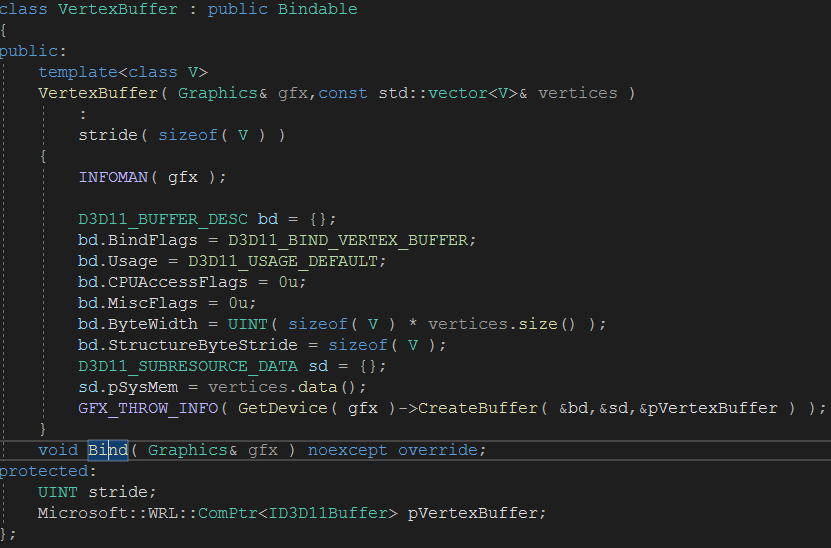 figure 2b 저 Syntax 자체가 gfx, model.vertices를 Arguments로 VertexBuffer Type을 Bind하겠다. 라는 선언과 같습니다. 그 이유는 VertexBuffer의 구현을 보면 이해가 갑니다.