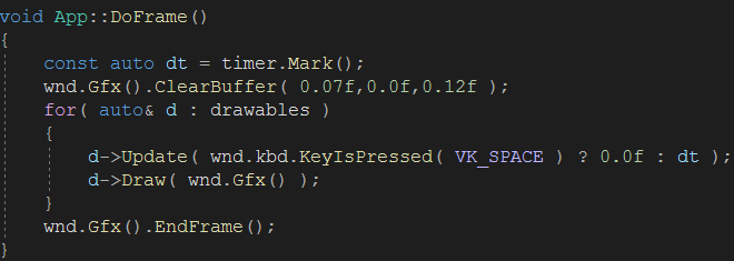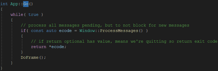 나름대로 분석해본 결과, 이 ChiliFramework는 Window 하나를 화면에 띄우면서 시작합니다. 따라서 가장 먼저 모든 절차에서 분리할 수 있는 요소는 Window를 초기화하는 과정이라고 할 수 있습니다. 그렇기 때문에 App class가 만들어지는 순간 Window의 인스턴스를 만드는 과정에 따로 Encapsulate된 상태로 존재하는 것입니다.