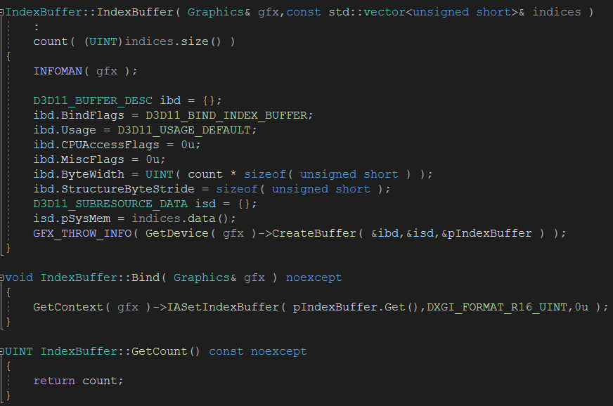 figure 2d 그 Bind의 내용은 여기에 있습니다. 이 VertexBuffer가 Bindable의 자녀 클래스이기 때문에 Bindable의 GetContext를 통해서 Graphics 인스턴스에 접근할 수 있습니다. 그러면 다음 과정이 예측이 되어야 합니다. Vertex Buffer를 Bind했으면 Index Buffer를 Bind할 차례입니다. 그런데, figure 1f를 참조하면 이미 index buffer가 생성이 되어 있음을 알 수 있습니다. 따라서 별도의 Index를 생성하는 추가적인 과정은 필요하지 않습니다.
