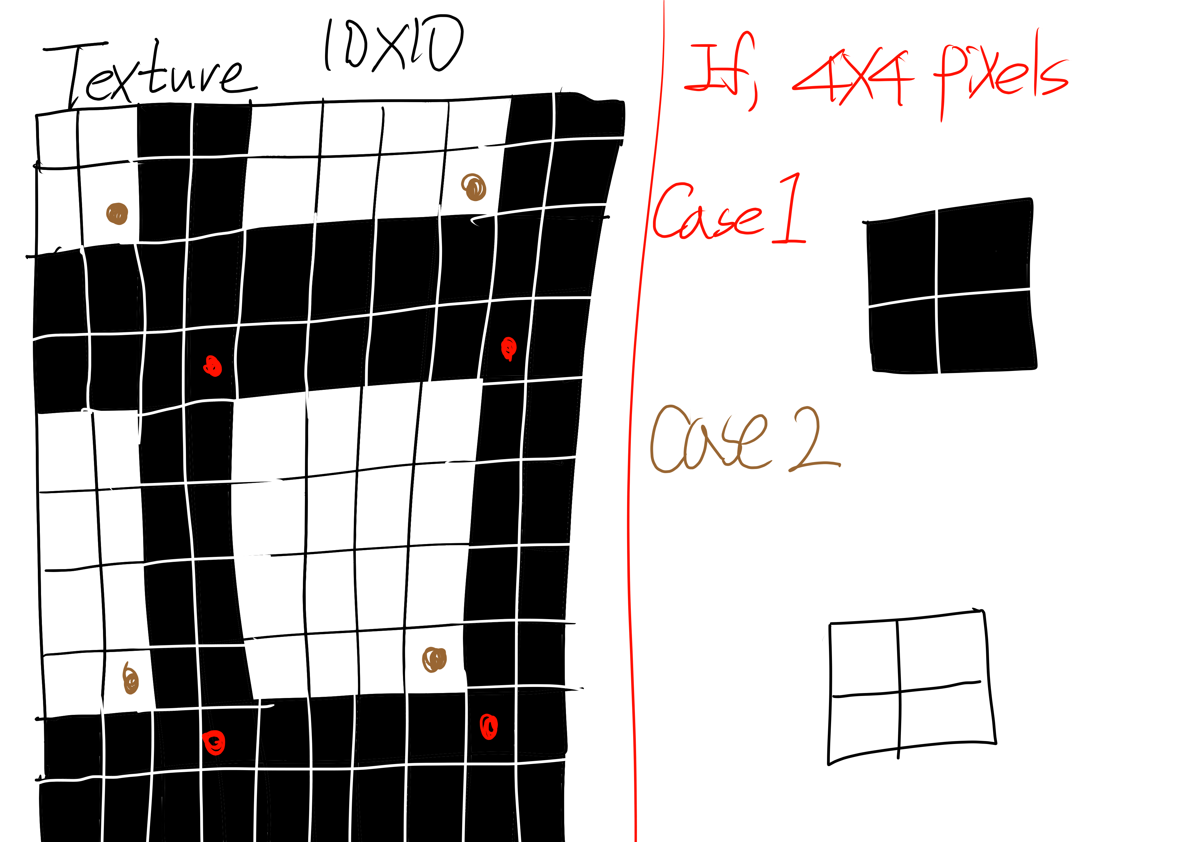 여기까지는 pixel이 texel보다 많아서 생기는 문제들과 해결책들이었습니다. 이번에는 반대로 texel이 pixel보다 많아서 생기는 문제를 살펴볼 것입니다. 직관적으로 어떤 문제가 생길 것인지 이미 감이 옵니다.