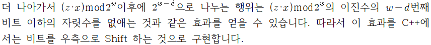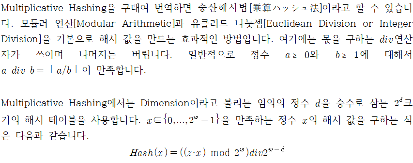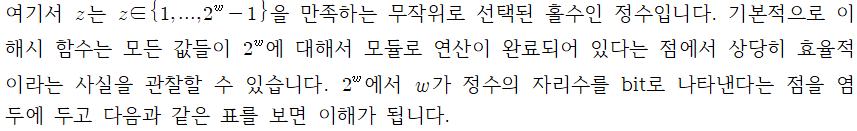 figure 1c. 반드시 기억해야 하는 것은 w=32, d=8일 때 결과 값이라는 사실입니다. * C/C++기준입니다. 다른 프로그래밍 언어에서는 Undefined Behaviour일 수 있습니다. 또한, 여기서 등장하는 HashCode(x)와 Hash(x)상당히 혼란스럽습니다. Hash(x)는 x에게 부여된 어떤 수를 갖고 배열 t의 index를 불러 온다고 생각하면 편합니다.