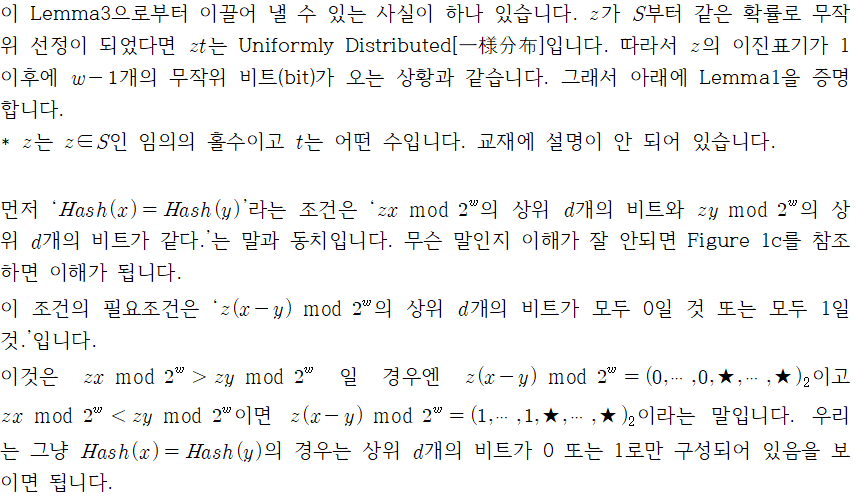 figure 1d. HashCode에 대한 이해는 다른 챕터에서 다룹니다. 현재는 적당한 수를 반환하는 것으로 만족해야 합니다 솔직히 Lemma1의 증명은 하나도 알아들을 수가 없습니다. 정말 간신히 번역만 한 정도입니다. 아직도 Hash(x)에서 모듈로 연산이 왜 코드에 반영이 안 된 것인지 설명할 수 없습니다. HashCode에 대한 부분을 살짝 엿보고 왔으나 답을 얻을 수 없었습니다.