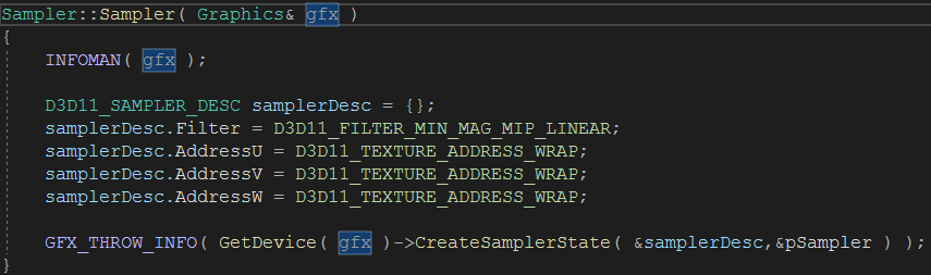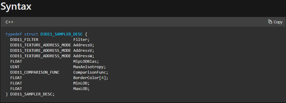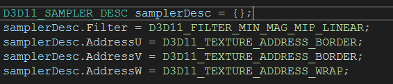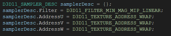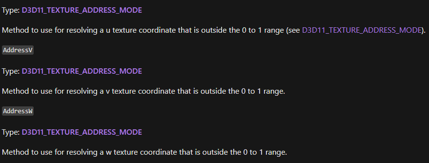 figure 4b Sample 또는 샘플, 샘플러 상태는 texture를 공부하며 함께 약간 다뤘습니다. D3D11_SAMPLER_DESC은 Sampling을 어떻게 할 것인지 결정하는 파트와 관련이 깊다고 보면 됩니다. 당장 Filter를 보아도 Texture sampling을 수행할 때 옵션을 걸어주는 파트라는 것을 알 수 있습니다. 특히 AddressU, V, M은 자세히 들여다 보아야 할 필요가 있기 때문에 따로 공부하기로 합니다. 그러나 이전 Texture에서 공부한 내용이긴 합니다. Texture 보다 큰 Pixel에 어떤 식으로 바를 것인지 결정하는 내용이기 때문입니다.